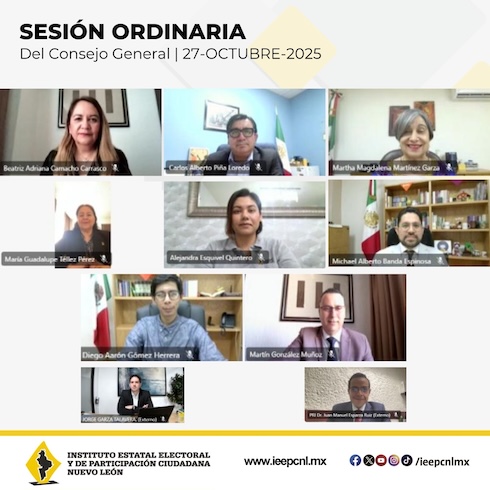 El Consejo General del Instituto Estatal Electoral y de Participación Ciudadana de Nuevo León (IEEPCNL) realizó la sesión ordinaria del mes este 27 de octubre, en la que informó las actividades públicas de la Consejera Presidenta y las Consejerías Electorales del Instituto, así como las acciones que llevó a cabo la Secretaría Ejecutiva y los escritos que recibió.