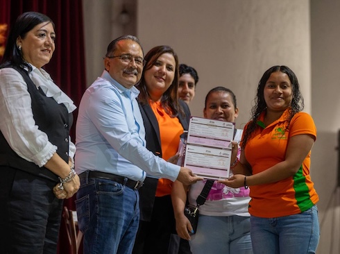 El Alcalde Andrés Mijes junto a Martina Salazar, Directora del CECyTE No. 1 entregaron las becas que ayudarán a los jóvenes a seguir con sus estudios.