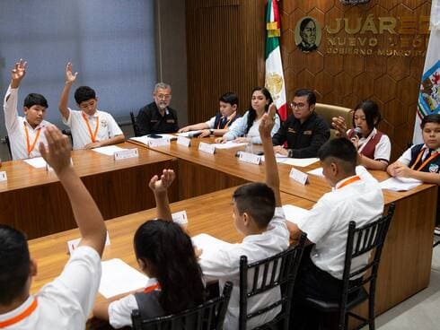Desde la Sala de Cabildo, 21 niños provenientes de distintas escuelas primarias y secundarias del municipio que conforman la Comisión de Participación de Niñas, Niños y Adolescentes, difusores del Municipio de Juárez, Nuevo León, abordaron temas de suma importancia y relevancia para los habitantes de Juárez, como la prevención del bullying en escuelas, el cuidado del medio ambiente y la protección de los animales.