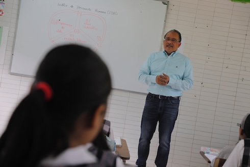 Después del “recreo” de los estudiantes, Mijes llegó al salón Primero “E” con un entusiasmo que evocaba sus años como docente, ahí, frente a los alumnos compartió sus conocimientos, anécdotas y, sobre todo, su inspiración para crecer y cumplir sus sueños.
