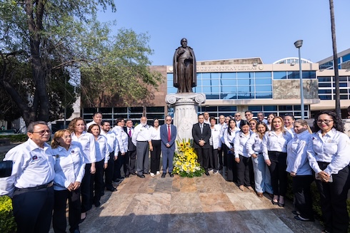 Al pie de su efigie, ubicada en la explanada de la Facultad de Filosofía y Letras, autoridades universitarias, directivos de la administración central de la Universidad, directores de preparatorias y facultades, académicos y estudiantes se congregaron para rendir homenaje al Regiomontano Universal.