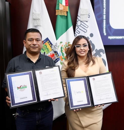 El evento tuvo lugar en la Sala del Pleno del Instituto donde el Presidente Municipal de Marín, Juan Carlos Rosales Herrera y la Consejera Presidenta del Instituto Estatal de Transparencia, Acceso a la Información y Protección de Datos Personales, Brenda Lizeth González Lara, firmaron el documento.
