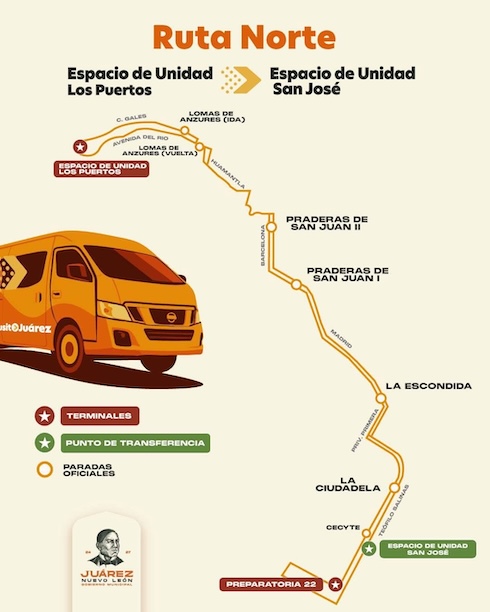 Por su parte, la Ruta Norte recorrerá 17 kilómetros con 14 paradas en total y un tiempo estimado de una hora. Iniciará su recorrido en el Espacio de Unidad Los Puertos, pasando por las colonias: Los Puertos, Villa Anzures, Lomas de Anzures, Praderas de San Juan, La Escondida, Villas de San Juan, Hacienda San José y Centro de Juárez, teniendo como destino principal la Preparatoria No. 22 de la UANL Unidad Juárez.