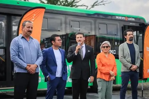 “Tenemos 4 mil nuevos camiones, orgullosamente Volvo, Hecho en Nuevo León, con clima, internet, seguridad, botón de pánico y además Fuerza Civil de manera estratégica yendo a la ruta donde puede haber denuncias o delitos.