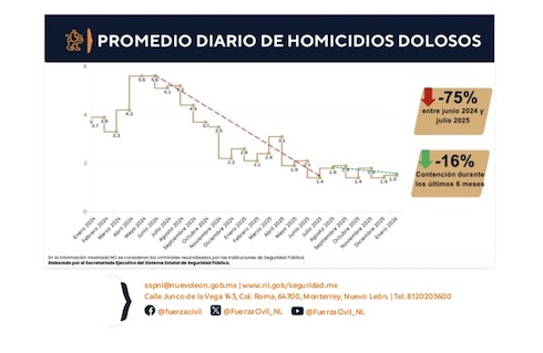 La Mesa de Construcción de Paz de Nuevo León informó que el año 2026 inició con su estrategia de contención de hechos delictivos, manteniendo un 39% menos homicidios que en el arranque de 2025.