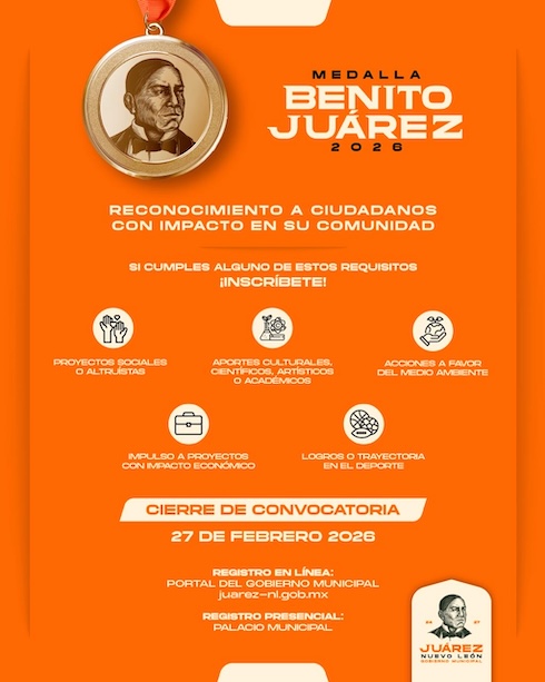 Con la finalidad de reconocer la labor trascendental de juarenses ejemplares que, a través de sus aportaciones, contribuyen al desarrollo y prestigio del municipio, el Gobierno Municipal de Juárez, encabezado por el Alcalde Félix Arratia Cruz, convoca a la ciudadanía a postular candidaturas para la Medalla Benito Juárez, Benemérito de las Américas, en su edición 2026.