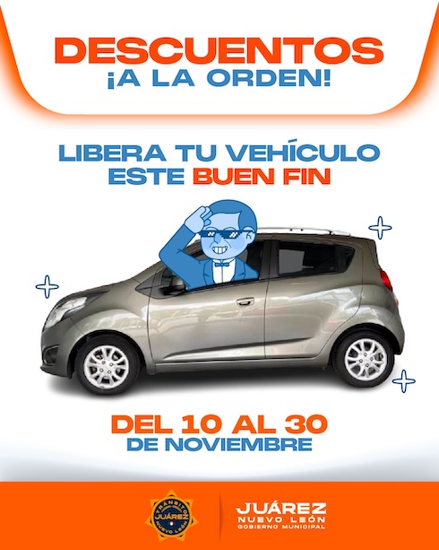 Con motivo del Buen Fin, el Gobierno Municipal de Juárez, a través de la Secretaría de Seguridad y Protección Ciudadana y la Dirección de Vialidad y Tránsito, dio inicio a la campaña “Descuentos a la Orden”, una estrategia vigente del 10 al 30 de noviembre de 2025, que busca apoyar la economía de las familias juarenses mediante facilidades para la liberación de vehículos en corralón y la autorización de folios de licencia de conducir a precios preferenciales.